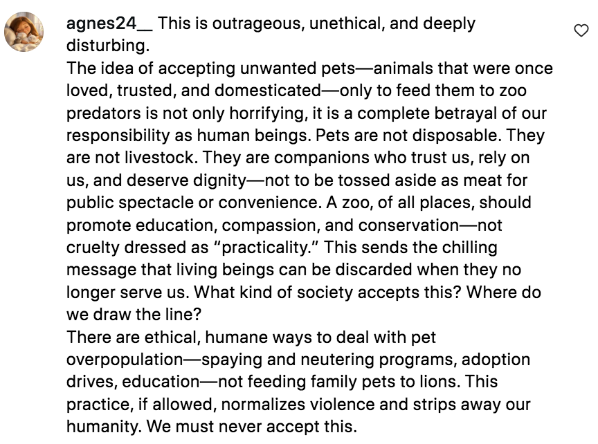 “将曾被人类喜爱、信任并驯养的动物接收进来,只是为了将它们喂给动物园的掠食者,这种做法不仅令人震惊,更是对人类应尽责任的彻底背叛!”