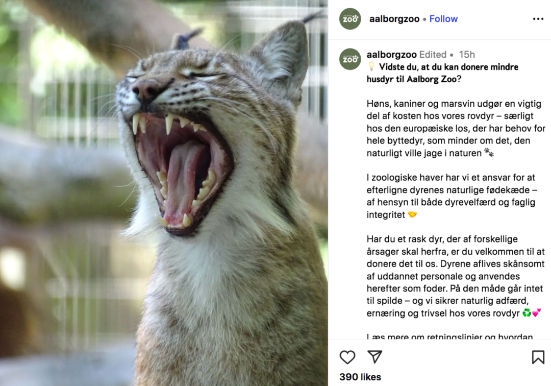 “您知道可以向奥尔堡动物园捐赠小型宠物吗?鸡、兔子和豚鼠这样的宠物,是我们的亚洲狮、欧洲猞猁和苏门答腊虎等捕食者的食物重要组成部分,它需要完整的猎物来重现野外捕猎的场景。在动物园,我们有责任模仿自然食物链,无论是在动物福利还是职业诚信上。