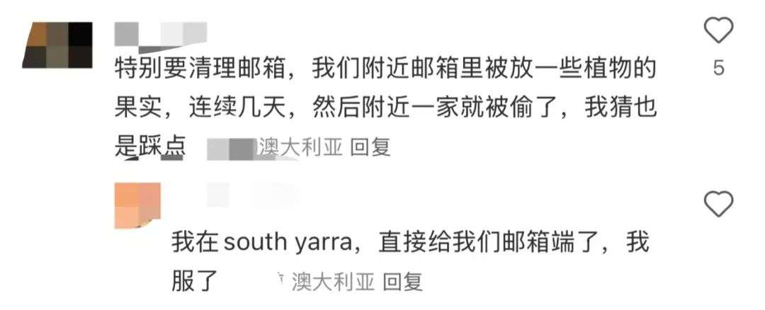 还有人发出提醒,在家附近发生过一件诡异的事,几户人家的邮箱被塞了一些植物果实,没几天,一个家庭就被偷了...