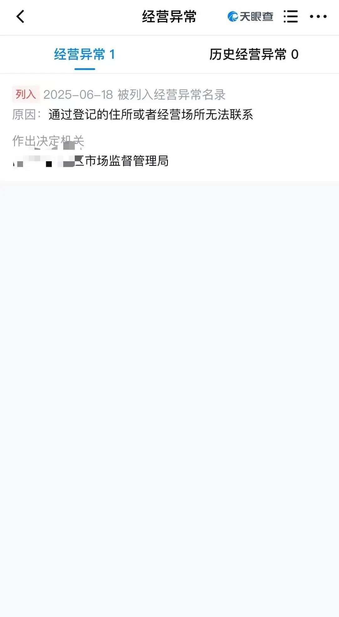 李女士表示,她在报警之后,发现该公司今年6月18日显示已处于经营异常,而公司被市场监管局列为经营异常名录,有网友在注册地址走访,也没有发现实体店。