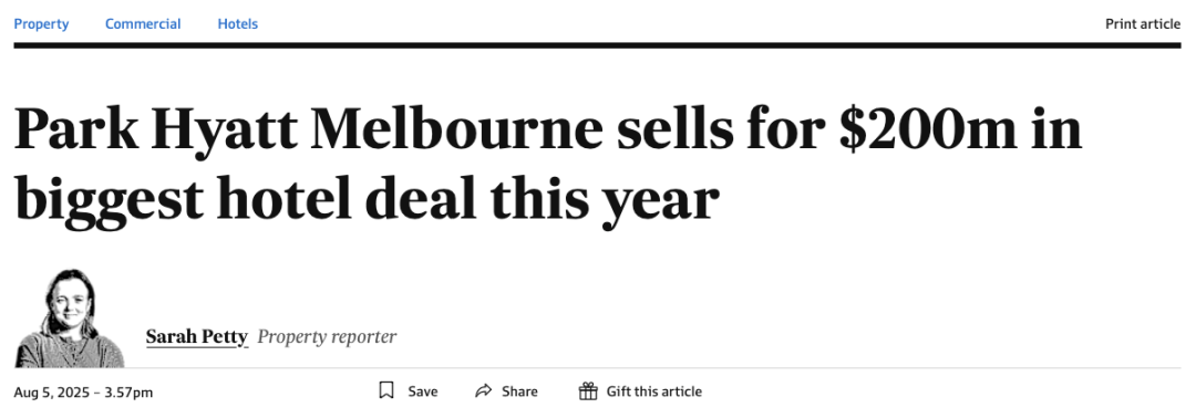 据Financial Review报道:泰国酒店集团KS Hotels斥资逾2亿澳元收购墨尔本柏悦酒店,成为2025年迄今澳洲最大规模的酒店交易。