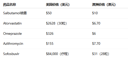 从表格上的对比可以看到,在美国卖几百甚至上千美金的药品,在澳洲只需要个位数。