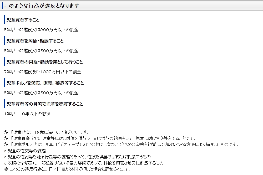 虽然在日本性行为同意年龄是13岁,但《儿童卖淫色情制品禁止法》规定未满18岁的未成年人禁止从事风俗业或进行性交易。任何与未成年进行性交易的人,将被判处5年以下有期徒刑、300万日元以下罚金。