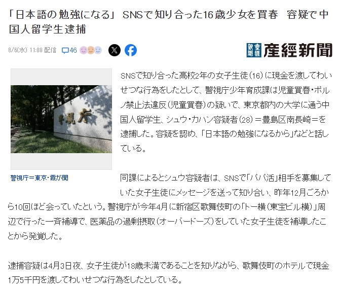 一位名叫周嘉函(暂时音译)的28岁中国籍留学生因涉嫌违反日本《儿童卖淫色情制品禁止法》而被东京都警视厅逮捕归案!