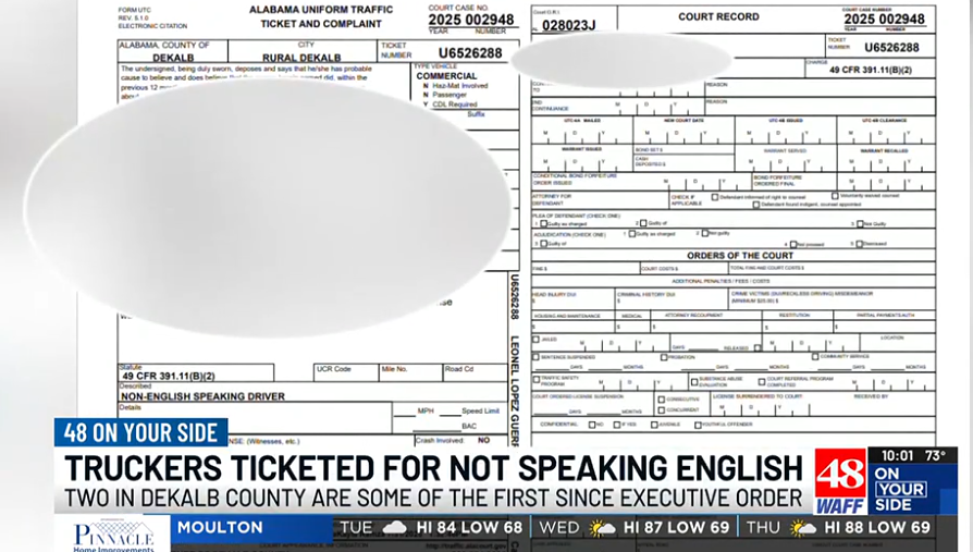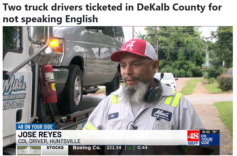 根据阿拉巴马州地方电视台WAFF报道,这两名司机分别来自佛罗里达州和德克萨斯州,具体姓名未被公开。他们在驶经阿州迪卡尔布郡(DeKalb County)时,被执法人员发现英语能力无法满足沟通要求,因而遭处罚。
