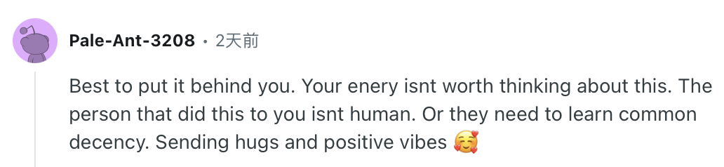 “最好还是把这件事放下吧。你的能量不值得浪费在这种人身上。做出这种事的人,不是人,就是还需要学会最基本的礼貌。给你送上拥抱和满满的正能量。”