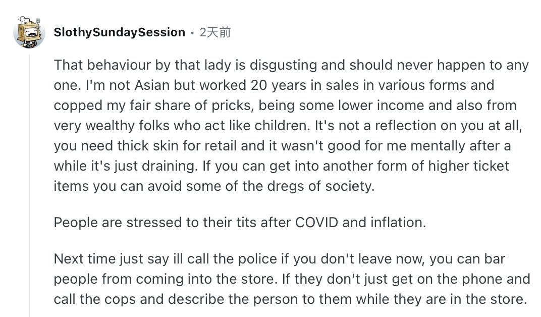 “那个女士的行为太恶劣了,这种事根本不应该发生在任何人身上。我不是亚裔,但我在销售行业干了20年,各种形式的都做过,也遇到过不少混蛋——有的是低收入人群,也有的是非常有钱却像小孩一样耍赖的客户。这完全不是你的问题。做零售真的需要一张‘厚脸皮’,但这对心理状态很不友好,时间久了真的会被榨干。如果可以的话,试着去做一些客单价更高的工作,这样可以避开一部分‘社会渣滓’。