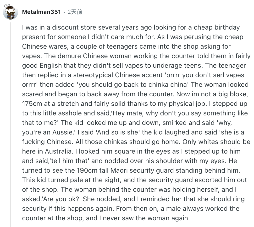 “几年前我在一家折扣店挑礼物,两个青少年走进来问有没有卖电子烟的。柜台后面是一位温柔的中国女士,她用相当流利的英语说店里不卖给未成年人。结果其中一个男孩立刻用夸张的中国口音模仿她,还骂她‘滚回中国,这里只属于白人’。她吓得往后退,我看不下去,上前问那男孩怎么不敢对我这么说?他笑着说因为我是澳洲人。我只回他一句:她也是。