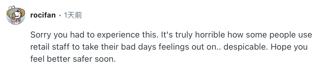 “很抱歉你经历了这样的事情。有些人把自己糟糕的一天发泄在零售员工身上,真的太可恶了。希望你很快能感觉好一些,也希望你以后能更安心、更安全地工作。”