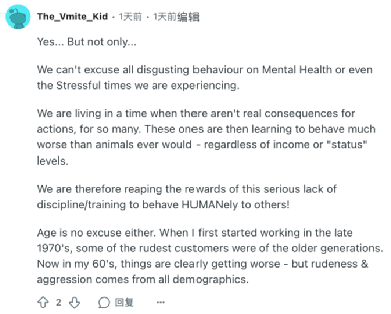 年龄也不是借口。我在上世纪70年代末刚开始工作时,一些最粗鲁的顾客就来自年纪较大的群体。如今我已经60多岁了,明显能感觉到事情变得更糟了——但无论老少、身份如何,粗鲁与攻击性早已存在于各个群体中。”