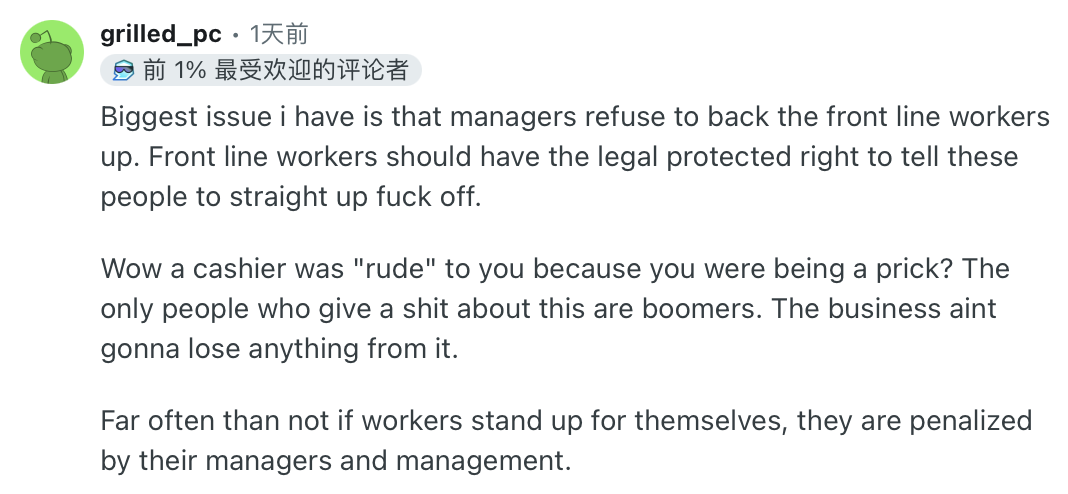 “我认为最大的问题是很多经理根本不支持一线员工。一线员工应该拥有法律保护的权利,可以直接让这些人滚蛋。但现实中,员工如果为自己发声,很多时候反而会被经理或管理层处罚。”