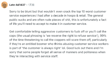 “抱歉说得直接点,但这事还排不上我在餐饮和零售业十年里遇到的前十糟糕顾客经历。公众真的很糟糕,很多人就是粗鲁又讨厌的混蛋,这很不幸,但确实是你如果想在服务行业生存下去就必须接受的现实。