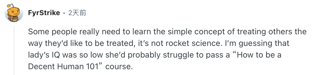 我猜那位女士的智商可能低到连“如何做个像样的人101”这种入门课程都考不过。”