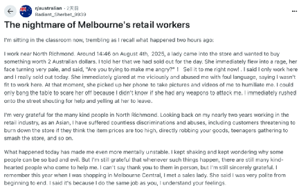 事情发生在2025年8月4 日下午,在North Richmond附近,博主在店里打工。然而,一位顾客因为买不到一件2澳元的小商品,立刻发飙,怒吼、辱骂,还掏出手机对她拍视频羞辱。