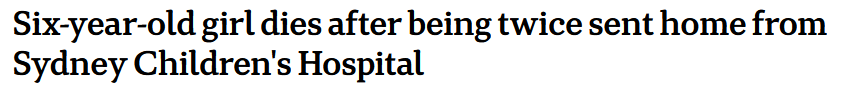 据报道,本周一名6岁女孩在悉尼东部的悉尼儿童医院(Sydney Children's Hospital)看急诊,却两次都被送回家,结果不幸死亡。