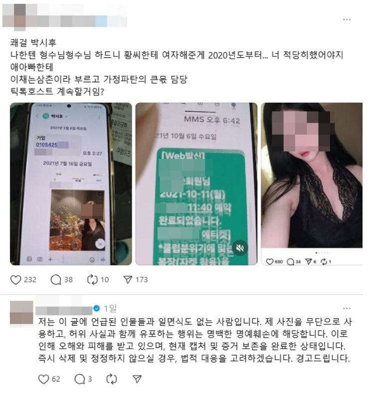 朴施厚本人也亲自否认了“拉皮条”:“社交平台上提出的质疑毫无事实依据”、“对于散布虚假信息的行为,我们将采取法律措施”。