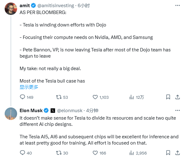 马斯克在社交平台X上回复网友称,特斯拉分散资源并同时开发两种截然不同的AI芯片设计是没有意义的。