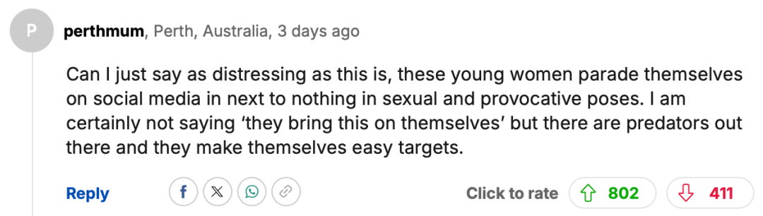 “我只能说,尽管这令人痛心,但这些年轻女性在社交媒体上几乎一丝不挂地摆出性感挑逗的姿势炫耀自己。我当然不是说她们自作自受,但世上确实存在着掠食者,她们让自己很容易成为攻击目标。”