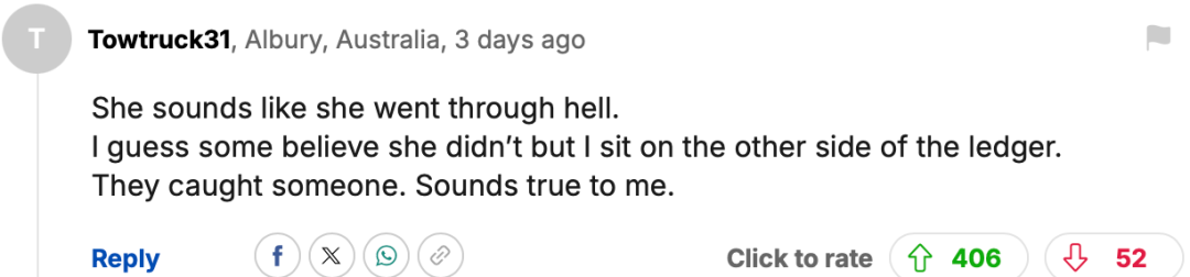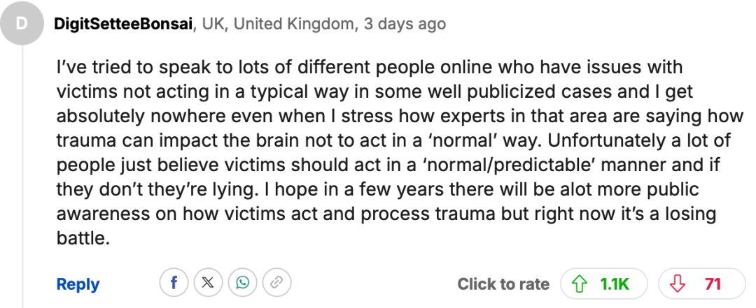 “我尝试在网上与许多不同的人交流,他们对于受害者在一些广为人知的案件中行为异常感到不满,但即使我强调该领域的专家是如何解释创伤会影响大脑,使其无法做出‘正常’行为,我也无法改变他们的陈旧观念。