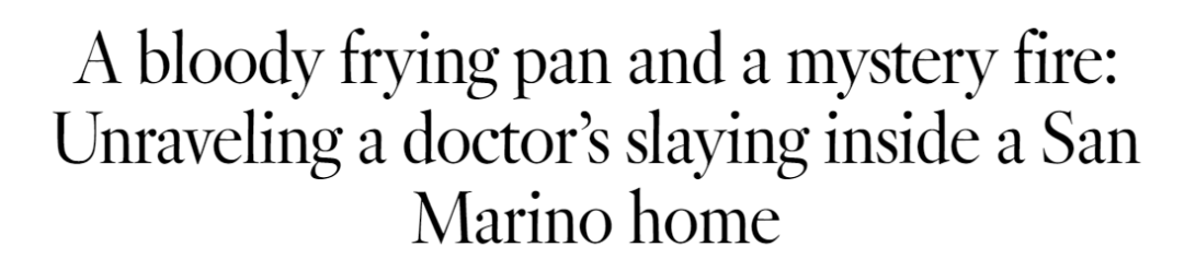 据LA Times 8月7日报道 当一位备受尊敬的医生、双胞胎的母亲在她那被烧焦的豪宅书房中被发现身亡时,圣马力诺(San Marinoo)社区的居民都震惊不已。