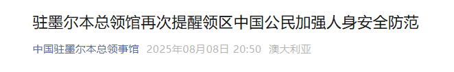 对此,中国驻澳洲总领馆提醒广大中国公民务必加强人身安全防范,密切关注当地新闻动态和治安形势,尽量减少夜间外出。