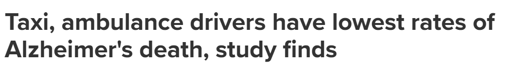 最新研究数据显示,与从事数百种其他工作的成年人相比,出租车司机和救护车司机因阿尔茨海默病而死亡的比率显著较低。