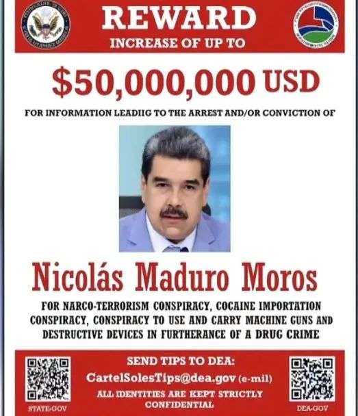 与军事指令几乎同步,川普政府周四宣布,将逮捕委内瑞拉总统尼古拉斯·马杜罗(Nicolás Maduro)的悬赏金额从2500万美元提高至5000万美元,指控他是全球最大的毒品贩运者之一,并与贩毒集团合作,将掺有芬太尼的可卡因大规模走私入境美国。