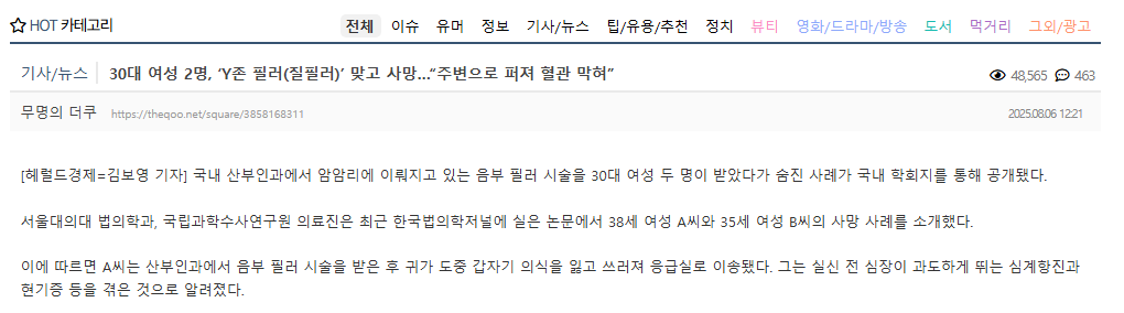 近日,一篇今年4月发布的报道在韩国某著名网络社区引发了热议——韩国两名30多岁女性因接受私密部位填充手术死亡。