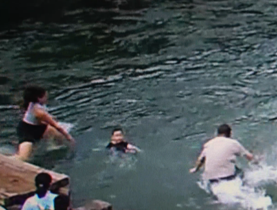 △外国女游客和岸边男孩的爷爷同时跳入水中救人
