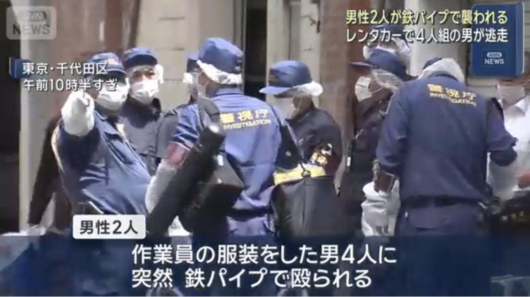 31日,在东京神田车站附近,2名中国人遭4名穿着工作制服的男子用铁管殴打,2名中国人头部受伤流血,暂无生命危险。2人称并不认识对方,是突然遭到袭击。