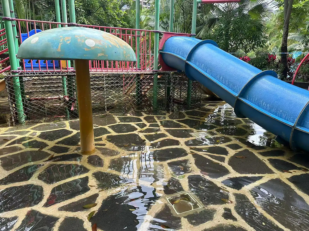 这个水寨位于酒店客房附近的温泉区,采用动态循环水系统,游乐区域由平台、滑滑梯、水蘑菇等设施组成,水泵启动后,水流通过回水装置形成喷泉效果。