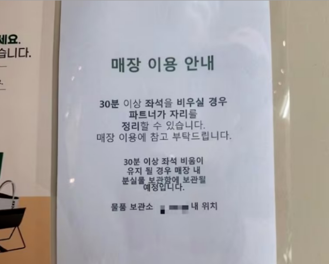 早在今年5月,就有韩国网友发现首尔某星巴克张贴了针对“咖学族”、“咖工族”的告示:“离开座位30分钟以上店员将清理座位,顾客个人物品将被保管于店内失物保管箱。”
