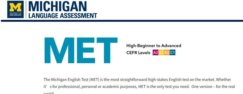 由美国密歇根大学与剑桥大学联合成立的 Michigan Language Assessment 机构推出,2009 年上线,2021 年推出安全的数字化版本。CEO Sharon Harvey 表示,这次被澳洲认可,是对 MET 考试有效性与可靠性的高度肯定。