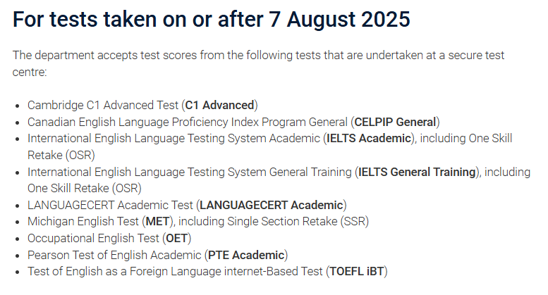 根据澳洲内政部信息,自 8 月 7 日起,部分考试的分数要求已作更新,具体标准及对应签证类别已公布在其官方网站。建议考生在报考前查阅最新分数线,确保成绩满足签证申请条件。