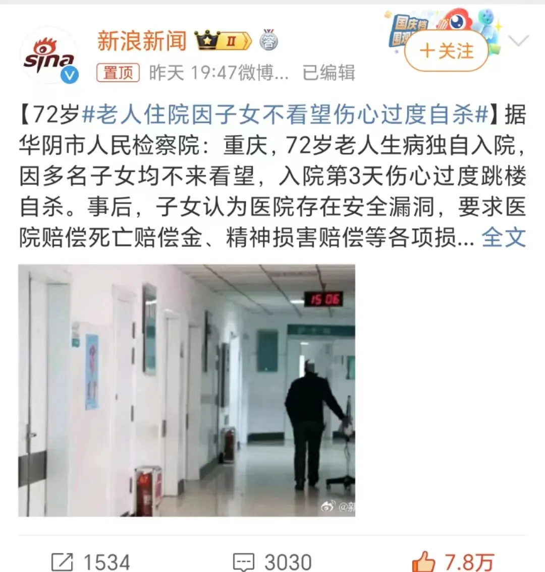 忽然想起重庆那个72岁的老人,重病住院后三个子女无一前来看望,都生怕要自己花钱。