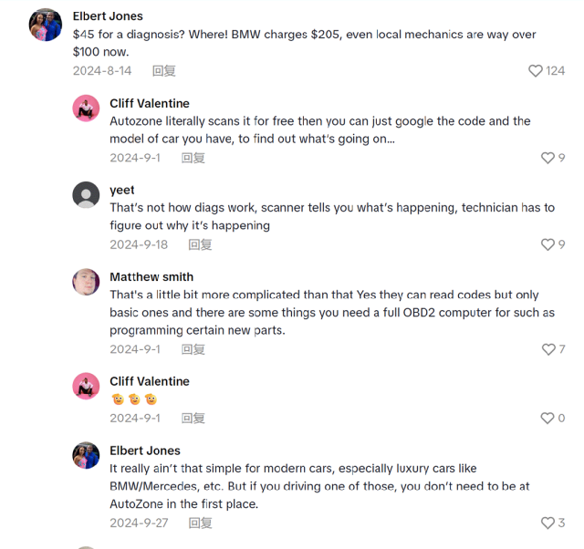 “诊断只需要45美元?哪里买!宝马4S店的收费是205美元,即使找当地机械师也远远超过100美元。”一位粉丝在达人视频下的评论获得了一百多个点赞,还有一个用户直接爆了猛料,“我在汽修店遇到员工用这个机器检测,然后向客户收取100美元”。