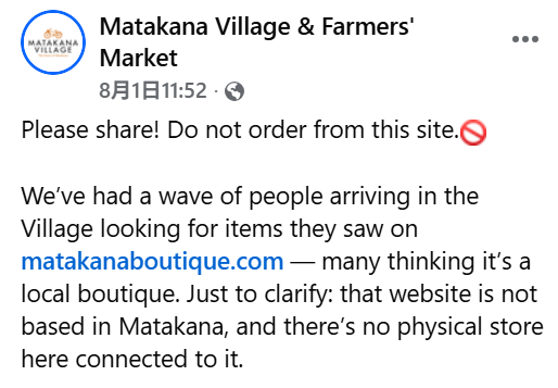 “这个网站并不是Matakana本地的实体店,它和我们小镇完全没有关系!
