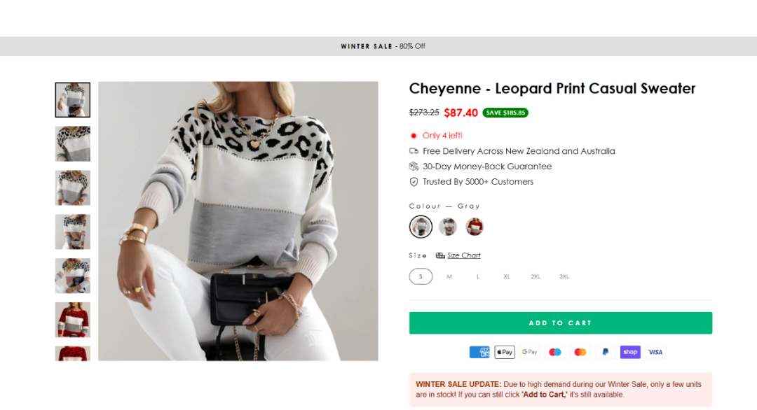 这些上门的女士所提到的豹纹毛衣,正是这个假网站上的第一个商品,上面显示原价273.25刀,打折后只要87.4刀。