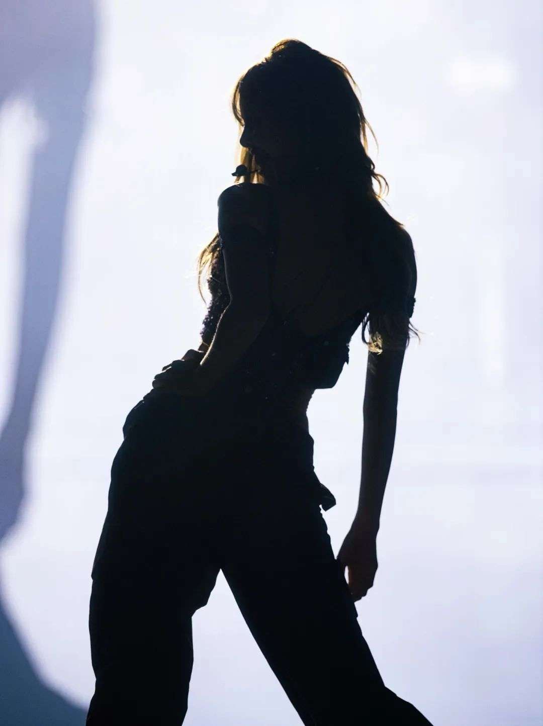 照片中,她身穿设计独特的短裤搭配镂空连体服,展现了完美的腹肌线条与修长美腿,散发出自信且强烈的舞台魅力。