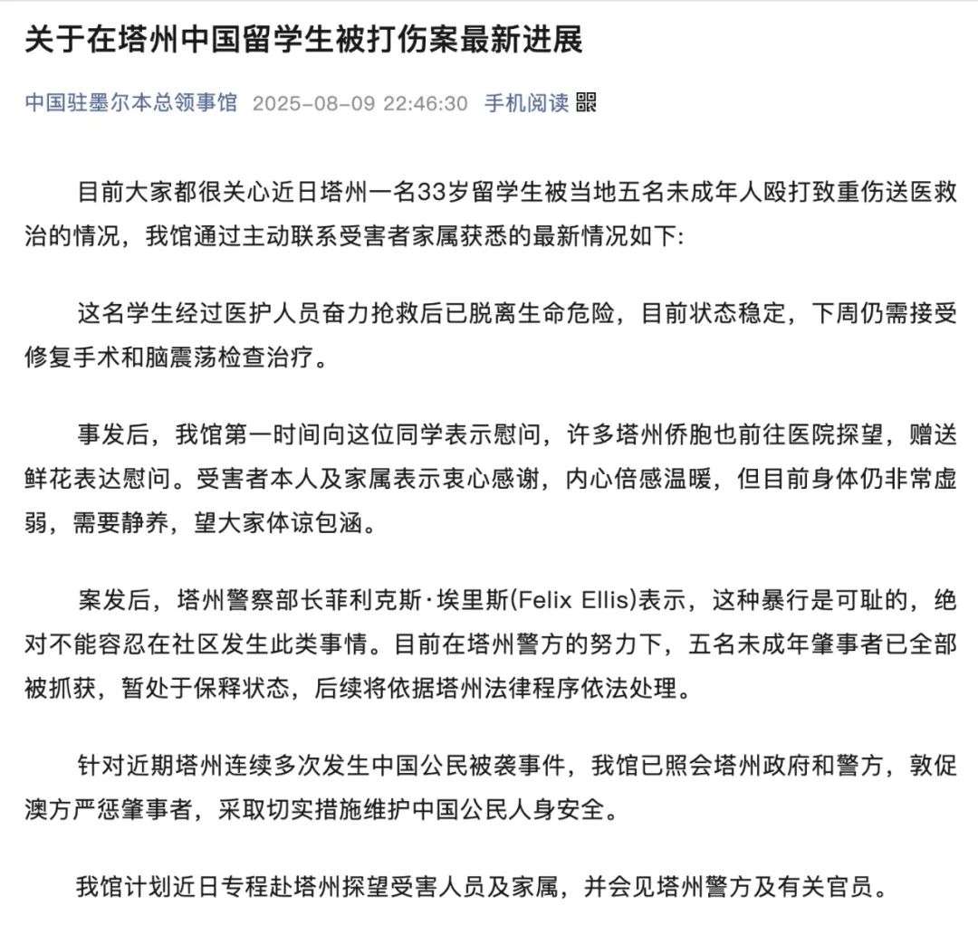 根据中国驻墨尔本总领事馆发布的在塔中国留学生被打伤案最新进展。