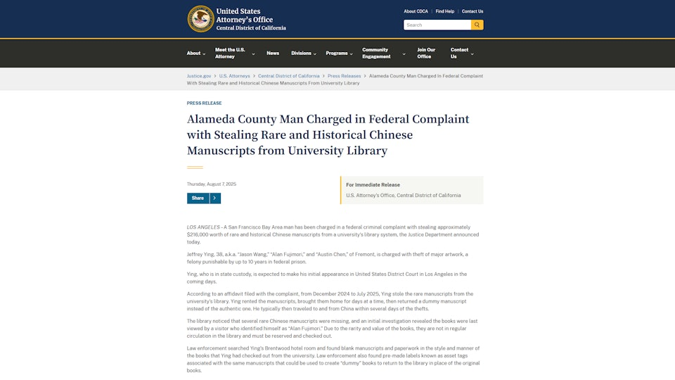 案件不仅涉及 UCLA,还牵出加州大学伯克利分校和尔湾分校的馆藏,真正被掉包的数量,很可能远不止这些。