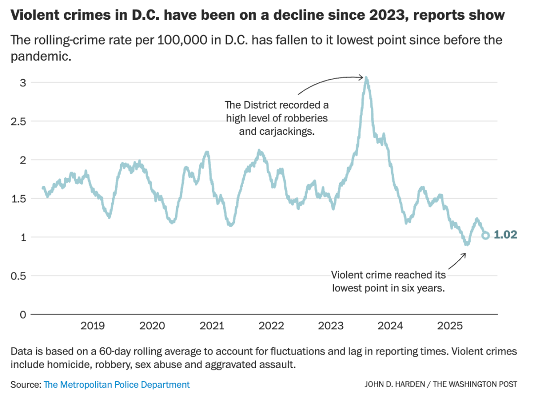 自2023年以来,华盛顿特区的暴力犯罪一直在下降。这一下降趋势是全国范围内暴力犯罪减少的一部分,2024年美国的凶杀率降至数十年来的最低水平。今年,根据《华盛顿邮报》从美国100多个大城市警察部门收集的数据,凶杀案数量下降了30%以上。入室盗窃和抢劫案件的报告数量也下降了两位数百分比。