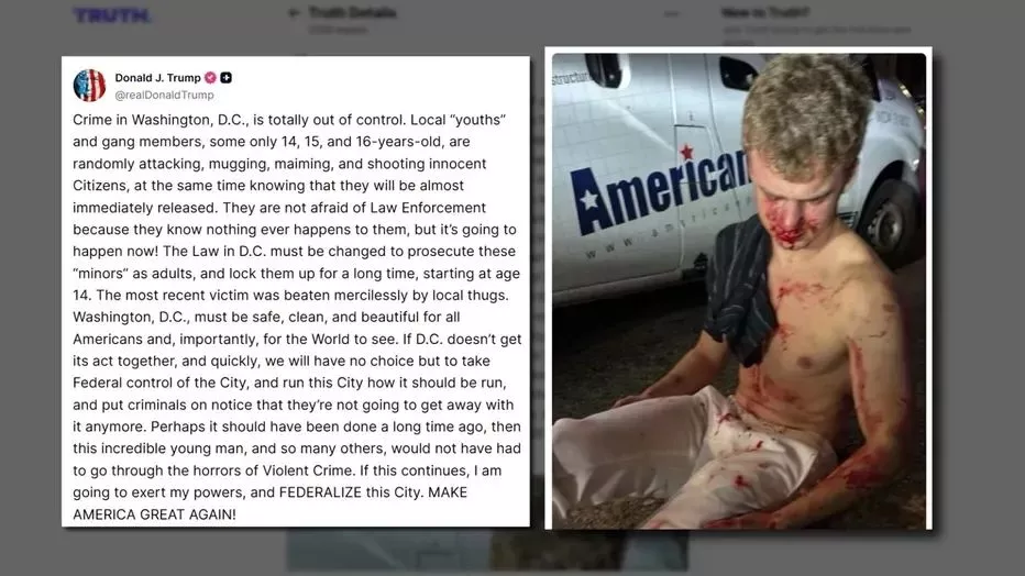 特朗普上周发布了一张科里斯汀浑身是血、赤裸上身坐在地上的照片,并警告说“如果华盛顿特区不迅速采取行动,我们将别无选择,只能让联邦政府控制这座城市。”