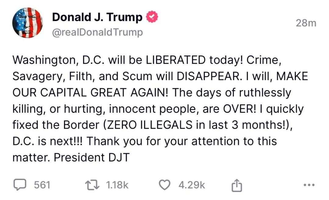 新闻发布会上特朗普说:“今天是华盛顿的解放日,我们将夺回我们的首都。”新闻发布会前,特朗普也在真实社交上发帖预告了今天将解放华盛顿:“华盛顿特区今天将被‘解放’!犯罪、野蛮、污秽和败类将会消失。我将让我们的首都再次伟大!”