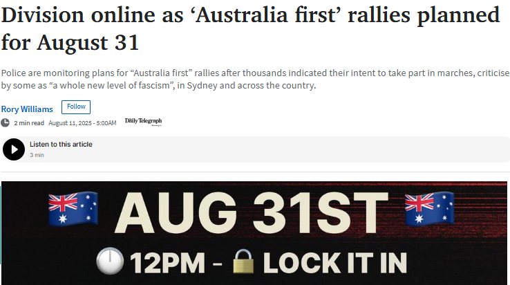 这场“澳洲优先”游行恰好定在8月31日,比全国性的亲巴勒斯坦大游行(8月24日)晚一周。