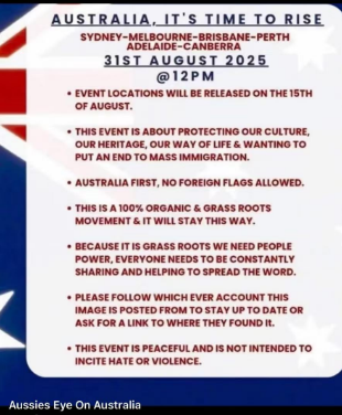 “我听说澳洲将在8月31日举行一场关于移民的抗议活动。从我看到的情况来看,这场活动被包装成是为了“拯救文化”,但在我看来,这并不是针对整个群体的理由。