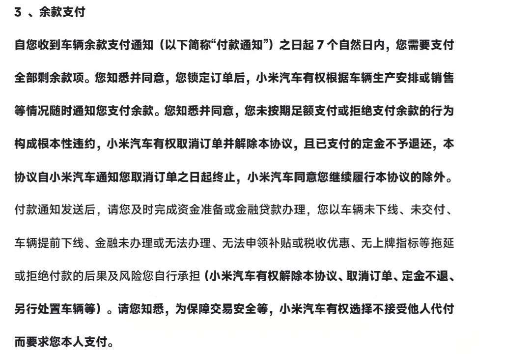 记者查看小米汽车购买协议也发现,协议关于“余款支付”一栏指出:“自您收到车辆余款支付通知(以下简称付款通知)之日起7个自然日内,您需要支付全部剩余款项。您未按期足额支付或拒绝支付余款的行为构成根本性违约,小米汽车有权取消订单并解除本协议,且已支付的定金不予退还,本协议自小米汽车通知您取消订单之日起终止,小米汽车同意您继续履行本协议的除外。”