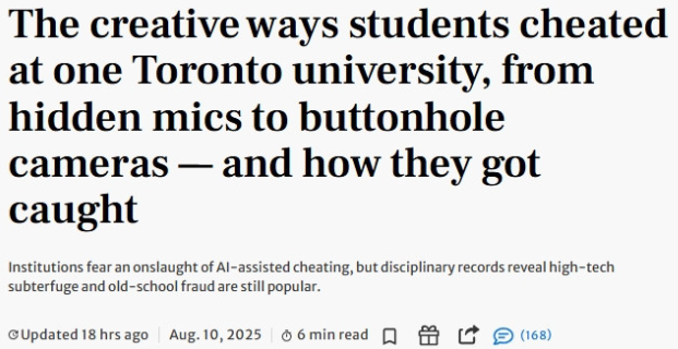 这当然不只是多伦多大学的问题。代写作弊是一项全球性的业务。数千名英国学生因滥用人工智能而被抓。一家美国杂志宣称“人人都在大学里作弊”。一项针对加拿大学生的调查发现,超过一半的学生曾目睹某种形式的学术不端行为。