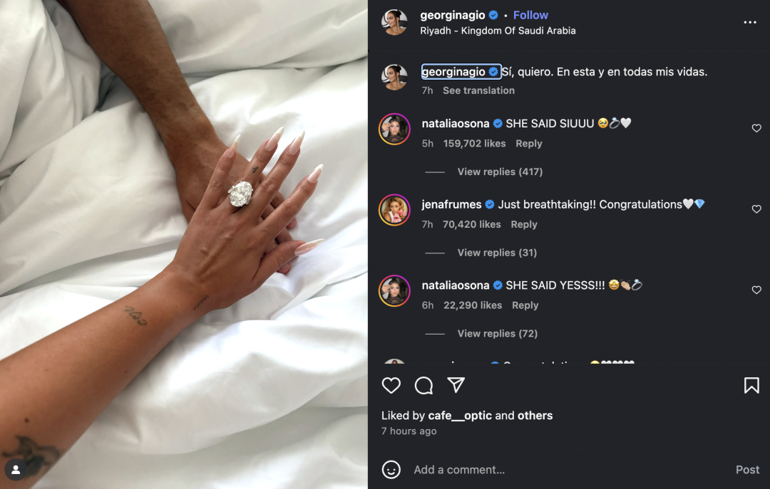 乔治娜在社交平台晒出一张照片——左手戴着巨大椭圆形钻戒,手掌轻放在罗纳尔多的手上!
