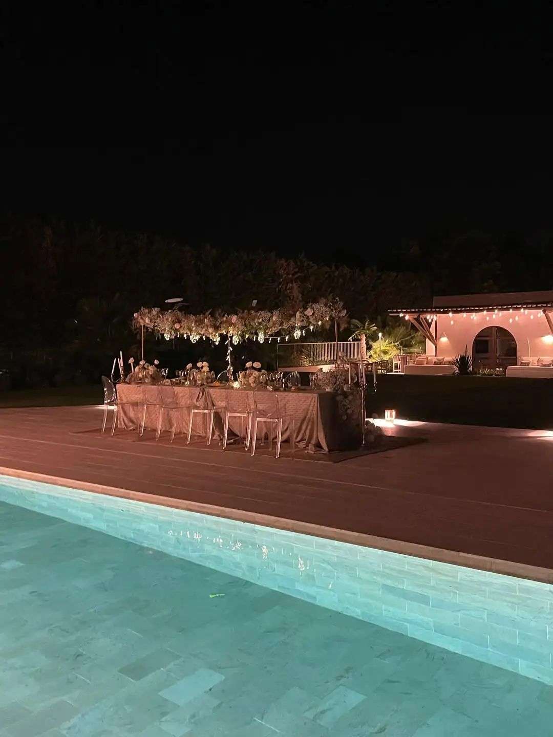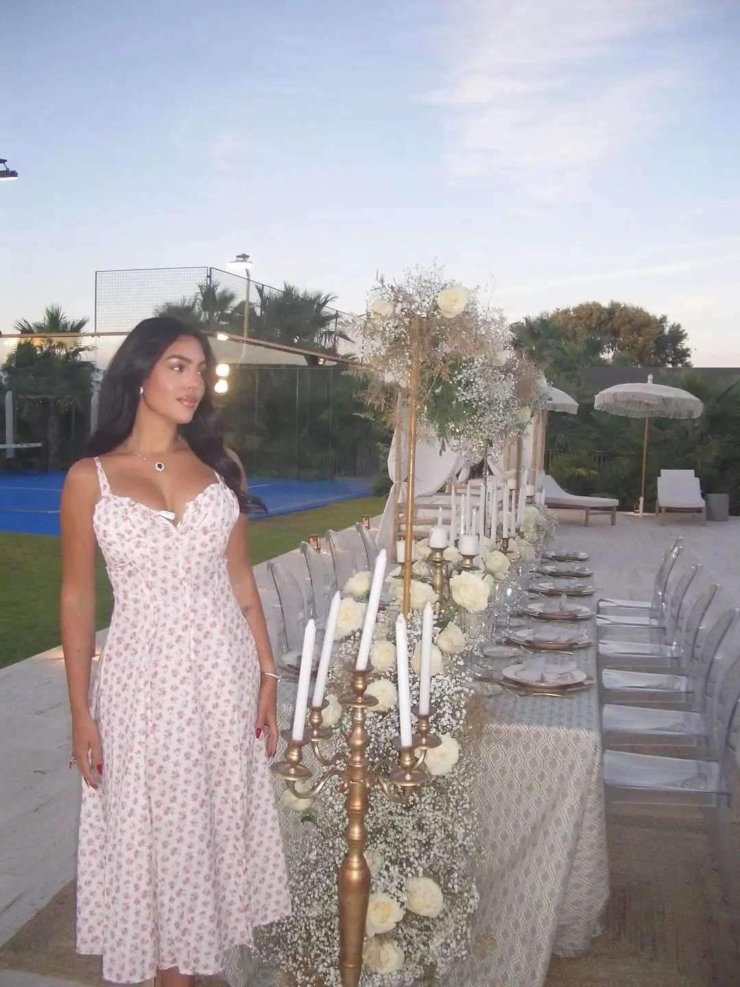 乔治娜晒出一场婚礼主题的晚宴,现场有“C ♥ G”抱枕、白色花卉和六人乐队,她的无名指上出现了大型钻戒。